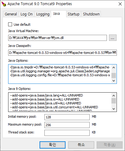 tomcat/bin/tomcat9 파일을 시작하면 상단 탭에 java를 클릭하여 자바에 대한 설정을 변경할수가 있다.