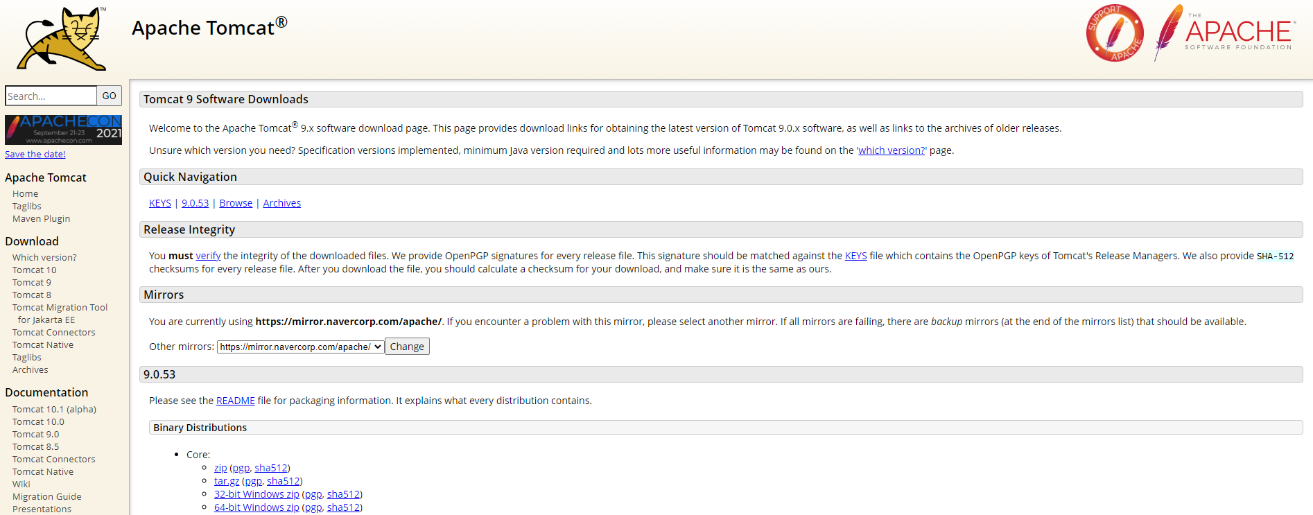 1. 우선 아파치 톰켓(Apache Tomcat)홈페이지에 들어가 다운을 받는다.