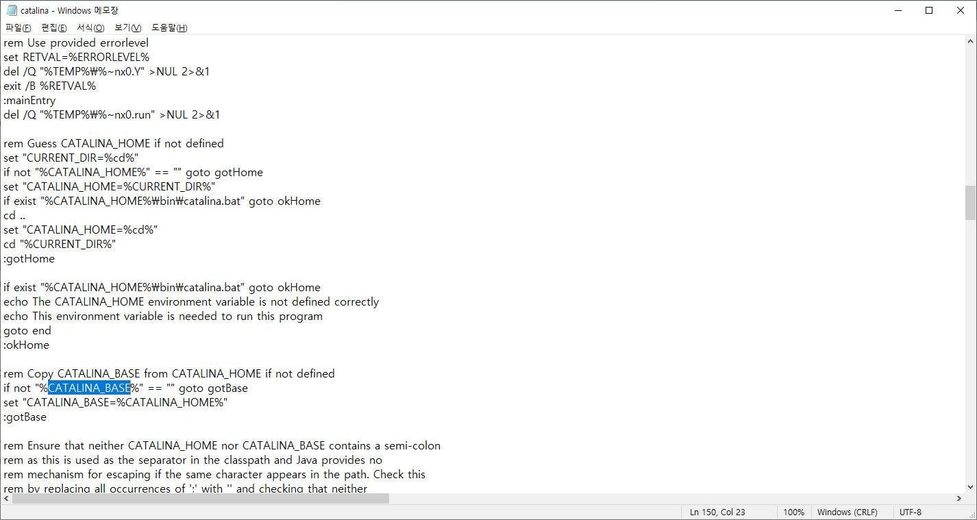 tomcat/bin/catalina.bat 파일을 열어보면 catalina_base에 대하여 초기화 하는 구절이 보입니다.